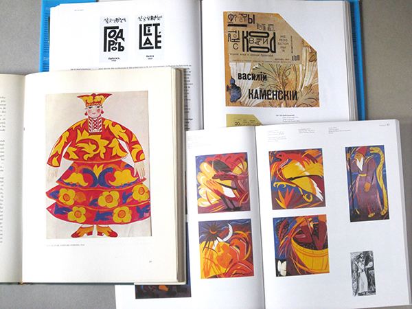 Kamenskii c’est la couverture en collage en haut à droite. Le reste c’est Natalia Gontcharova : costume pour Le Coq d’Or, couvertures N&B pour Gorod et une série de toiles (Le Phénix, le Prophète, etc.)