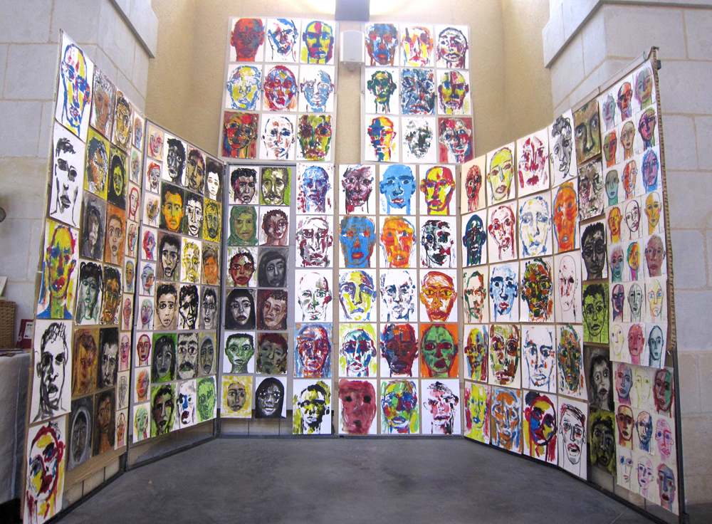 Le festival du livre Des mots à la bouche , c’est cette semaine dans les Halles de Beaufort-en-vallée. Le thème de cette année étant le portrait, j’y expose 159 visages peints ou dessinés.