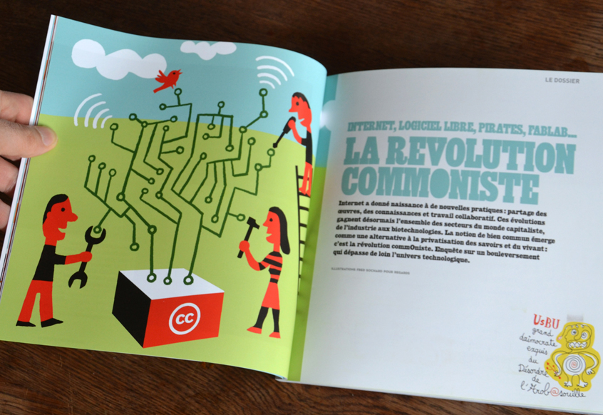 Internet, logiciel libre, pirates, fablab, wikipédia… Un dossier sur la « révolution commoniste » dans le Regards en kiosque actuellement. Une série d’illustrations dans une belle mise en page signée Sébastien Bergerat.