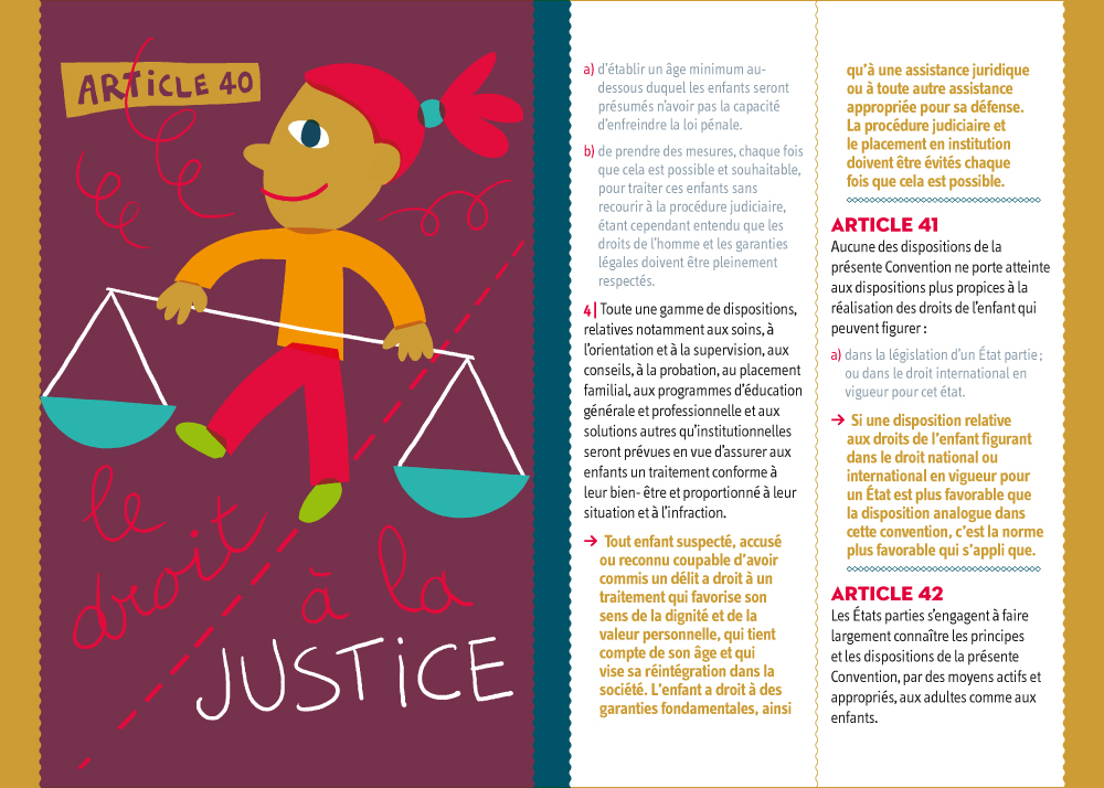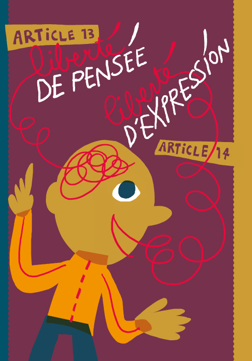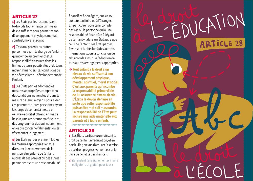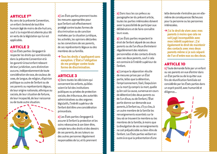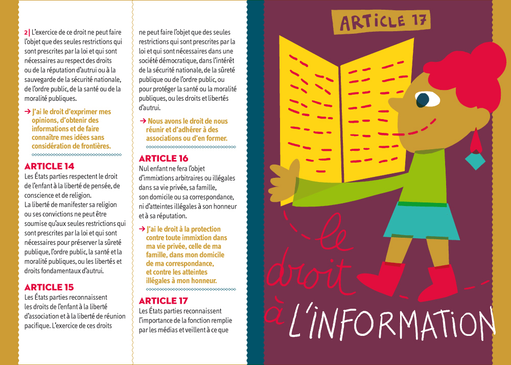 L’agence Médiris souhaitait marquer le 25e anniversaire de la signature de cette convention. Elle a donc imaginé la création d’un passeport des droits, remis à chaque enfant dans les villes partenaires, dans lequel sont déclinés les principaux articles de la convention. J’ai réalisé quelques illustrations pour les accompagner. Le très beau graphisme du passeport est signé Antoine Massari, de l’agence JBA.