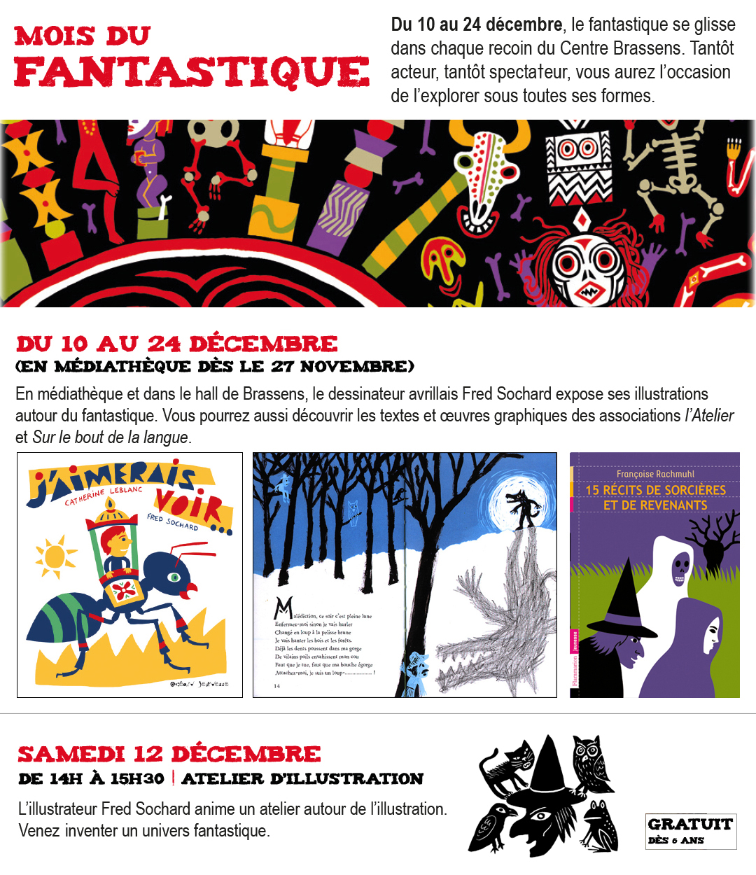 Au centre Brassens d’Avrillé, près d’Angers, c’est le Mois du Fantastique. Au programme : impros, contes , musique, ateliers d’écriture, jeux de rôles… Et une expo de mes illustrations en lien avec le thème : vampires, sorcières, dragons, mort, fantômes, esprits, métamorphoses et autres bizarreries !