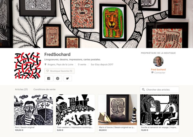 Les linogravures ne sont pas encore prêtes et arriveront bientôt, mais ça y est enfin… ma boutique est en ligne : dessins, impressions numériques, cartes postales… Une vingtaine d’articles pour le moment mais ça va se remplir et se diversifier !