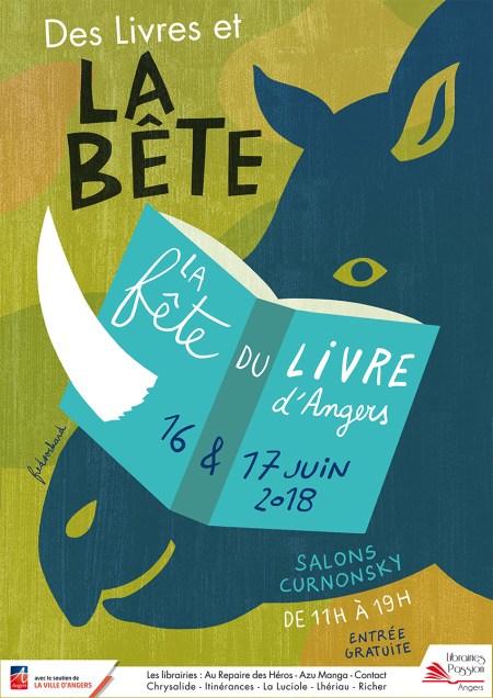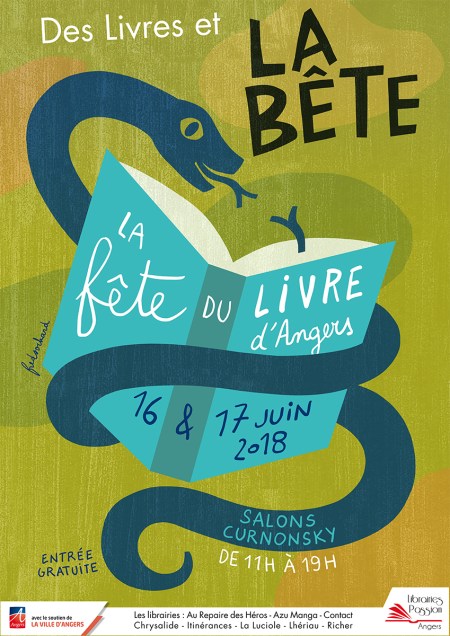 L’association des libraires d’Angers qui organise la Fête du livre (à laquelle j’ai participé il y a deux ans) m’a proposé en début d’année de réaliser l’affiche de l’édition 2018. Il y a cette année à la bibliothèque et aux Beaux-Arts d’Angers le thème du bestiaire, le thème de la fête du livre était donc Des livres et la bête. Du coup, je leur ai proposé une série de trois affiches, qui permet de jouer avec cette idée de bestiaire. Hélas, pour des raisons d’organisation, la Fête du Livre a dû être annulée cette année !
