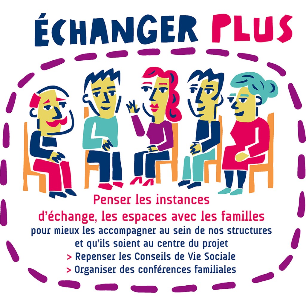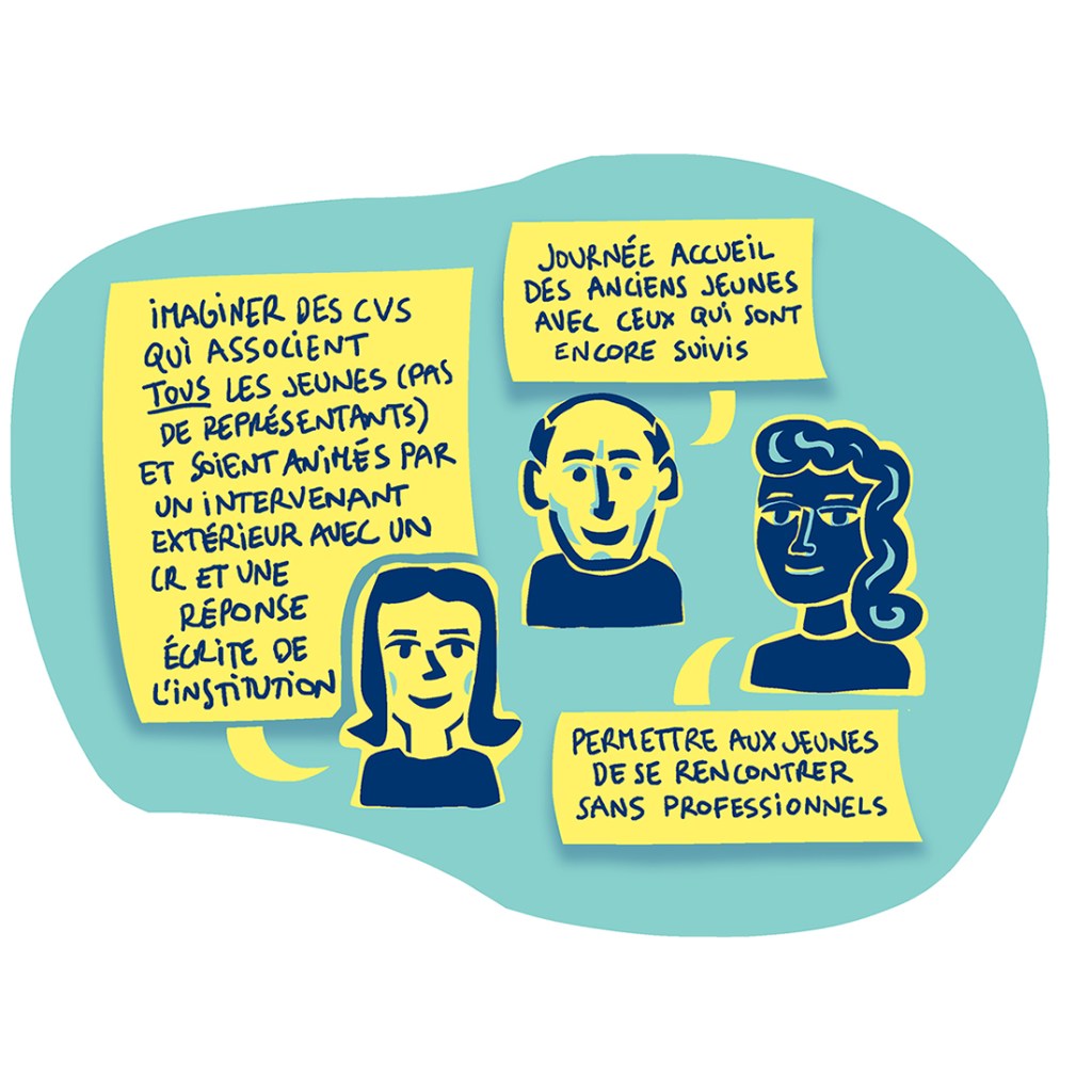 Les trois niveaux d’illustration correspondent au diagnostic des difficultés (dessins bleu et blanc), aux paroles recueillies lors d’ateliers (dessins bleu et jaune « post-it ») et aux perspectives souhaitées (dessins en couleur).