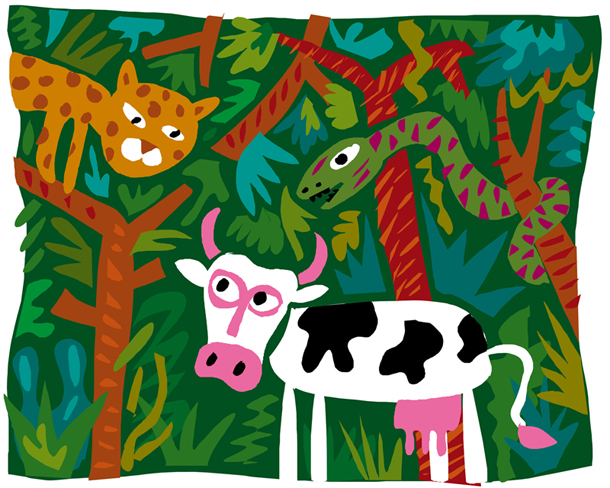 Un jour de mai 2012, je m’amuse à faire un dessin avec une vache… dans la jungle. Quelques temps plus tard, avec Catherine Leblanc (oui, l’auteur du Tango des animaux), nous nous proposons d’essayer de faire un livre ensemble, en commençant par échanger textes ou images qui pourraient nous inspirer mutuellement. Je lui envoie donc cette image, restée orpheline jusqu’alors.